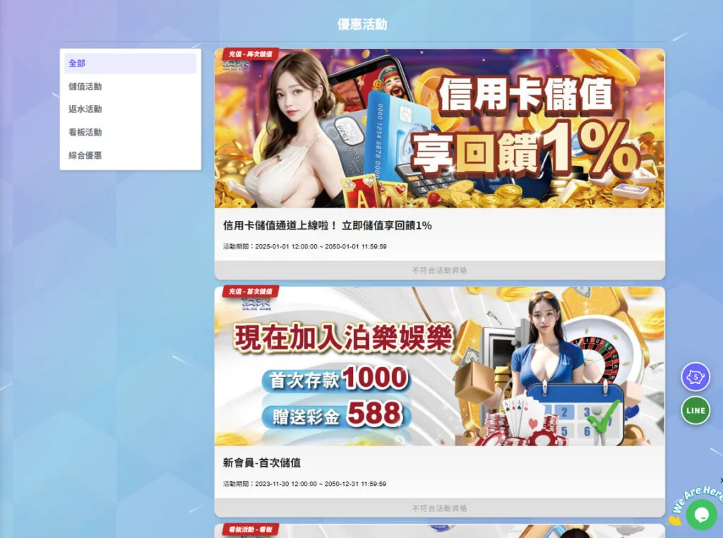 | 線上老虎機 | 結合上述各類玩法與創新技術,如動畫介面、音效強化、互動式挑戰等。玩家可依自身風格挑選喜愛主題遊戲,透過平台 24 小時隨時暢玩。 |